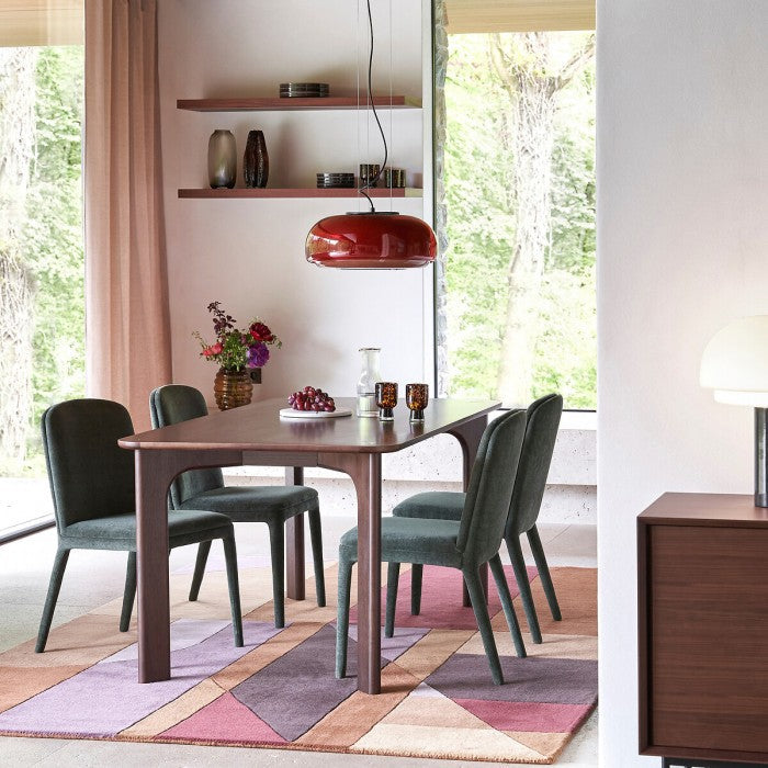 A modern pendant light that beautifully enhances dining tables and living spaces, it combines soft lighting for indirect illumination with sculptural design aesthetics.